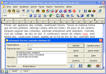 SALT es un programa de la Generalitat Valenciana que traduce documentos del castellano al valenciano y viceversa gracias a una enorme base de datos de palabras y expresiones. Una vez traducido el documento, SALT marca en rojo las palabras ambiguas o erróneas que requieran una elección del usuario entre varias sugerencias.